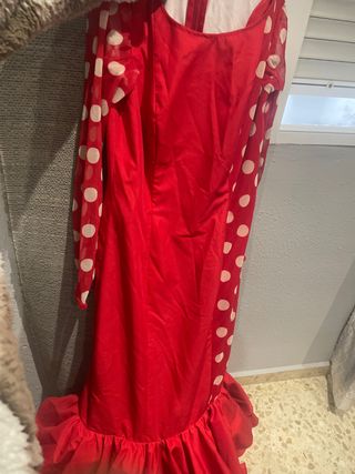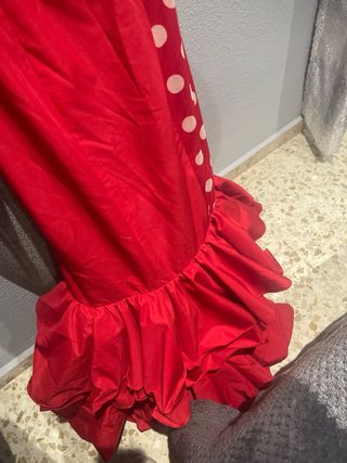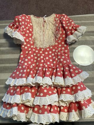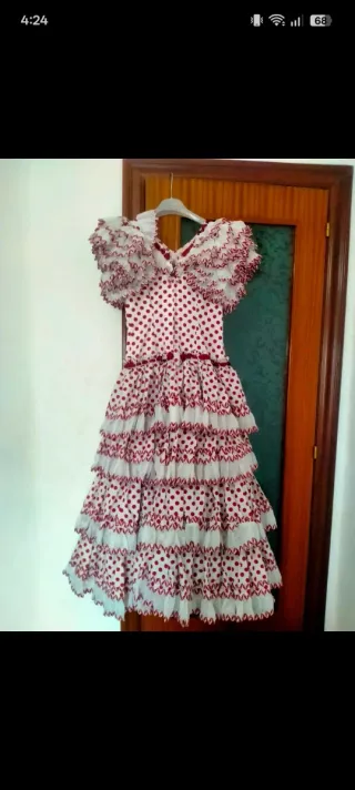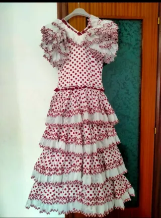 Precioso traje de flamenca para niña, usado solo un día. Está nuevo me lo hizo una modista. - Diseño de lunares,rojo con lunar blanco y volantes en manda y cuello blanco con lunar rojo y organdil. - Mangas con volantes. - Múltiples volantes en la falda.