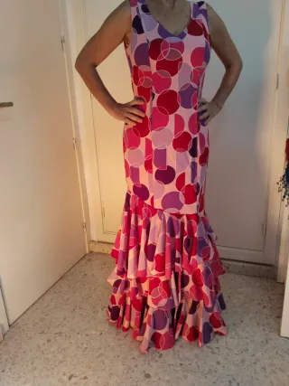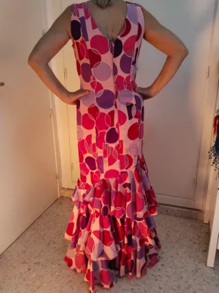 Traje de flamenca con un diseño alegre y vibrante, perfecto para ferias y celebraciones. - Estampado de círculos en tonos rosas y morados. - Múltiples volantes en la falda para un movimiento espectacular. - Diseño sin mangas. - Hecho por modista.