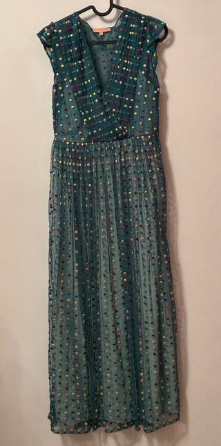 Vestido largo de tela transparente con un estampado de lunares de colores. Ideal para eventos o fiestas. - Diseño de lunares bordados. - Mangas cortas con volantes. - Falda plisada.