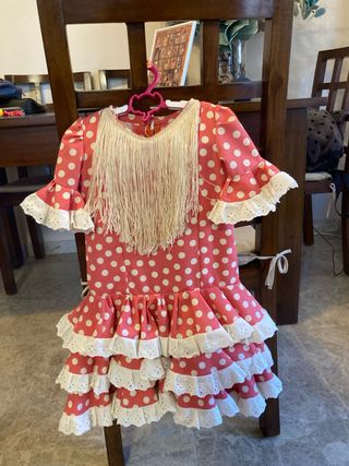 Traje de flamenca para niña con un diseño de lunares. - Cuerpo con volantes en las mangas. - Falda con varios volantes. - Adornado con flecos en el escote. - Detalle de puntilla en los volantes. Para una niña de 3 años aproximadamente. Largo total 61cm Cuepo:33cm Cintura: 28 cm Hombro: 22