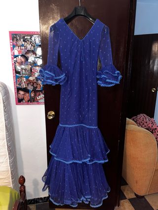 Traje de flamenca con un diseño alegre y llamativo. - Estampado de lunares blancos sobre fondo azul. - Volantes en mangas y falda. - Diseño ceñido al cuerpo.