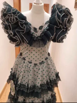 Vestido de flamenca con un diseño alegre y volantes. 40/42 SE ENVIA POR PUNTO PACK - Estampado de lunares verdes sobre fondo blanco. - Volantes en mangas y falda. - Adornos de volantes en negro y blanco.