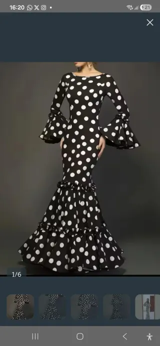 Vestido de flamenca con un diseño clásico de lunares. - Mangas acampanadas con volantes. - Cuerpo ajustado y falda con volantes. - Largo hasta el suelo. - para darle volumen al vestido necesita un canca. Mirar últimoas fotos