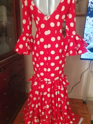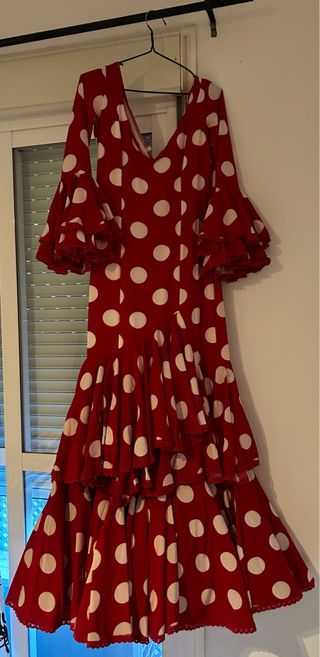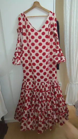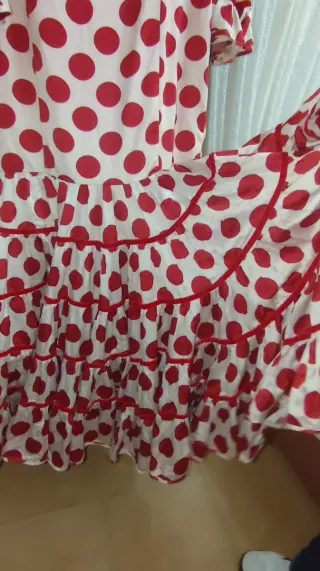 Vestido de flamenca con un diseño clásico y elegante. - Estampado de lunares rojos sobre fondo blanco. - Múltiples volantes en cascada a lo largo de la falda. - Mangas abullonadas con volantes. - Escote en pico.Precio ligeramente negociable.