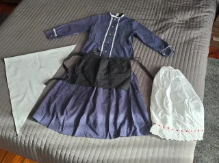 Conjunto de traje de aldeana con varios complementos. - Blusa de manga larga con detalles blancos. - Falda azul con estampado de lunares blancos. - Delantal negro. - Pañuelo a cuadros. - Convinacion blanca con detalles de encaje y puntadas rojas.
