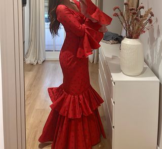 Traje de flamenca de color rojo, con un diseño elegante y detalles que lo hacen único. - Mangas acampanadas con volantes. - Falda con volantes y voluminosa. - Tejido con estampado de lunares sutiles.
