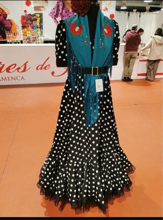 Elegante traje de flamenca canastero o gitana con un diseño de lunares. Color azul petroleo y lunar mediano negro. Tiene para sacar hasta dos tallas más. Con bolsillo interior con cremallera en los volantes. Sin estrenar. Muy ligero de peso y cómodo. No hago envíos. Tejido politecno. - Diseño de lunares en contraste. - Mangas acampanadas con volantes. - Falda con varios volantes escalonados.