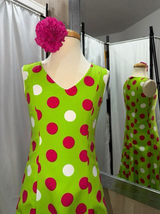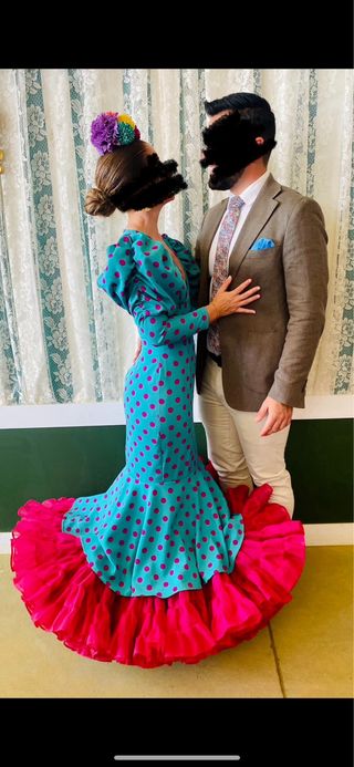 Traje de flamenca con un diseño de lunares llamativo. La falda tiene un voluminoso volante. - Diseño de lunares rosa fucsia sobre fondo verde agua fuerte. - Mangas abullonadas. - Volante inferior en color fucsia. - Pocas puestas. - En perfectas condiciones. - Paso medidas por privado.