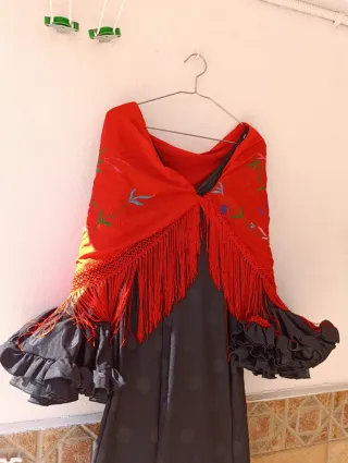Traje de flamenca negro con lunar + mantoncillo rojo 💃 Traje de flamenca en color negro con lunares, muy elegante y fácil de combinar. El corte es entallado y estiliza mucho la figura, terminando en una falda con gran volante canastero que aporta mucho vuelo y movimiento. Las mangas llevan volantes negros con bastante volumen, que le dan un toque muy flamenco. Incluye mantoncillo rojo bordado con flecos, que contrasta precioso con el negro del traje y completa el conjunto. Usado solamente dos días