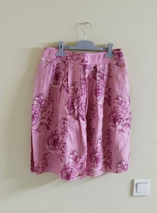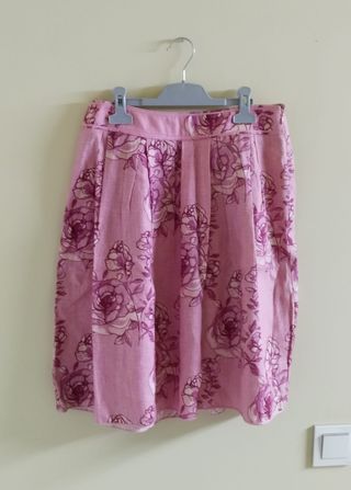 Pack de 3 faldas de mujer. Incluye: - Falda plisada rosa con estampado floral. Talla S. Marca: Mango. - Falda pegada con estampado floral. Talla S. Marca: Stradivarius. - Falda de lunares. Talla XL (según la etiqueta, pero creo q podría servir como M). Marca: H&M.