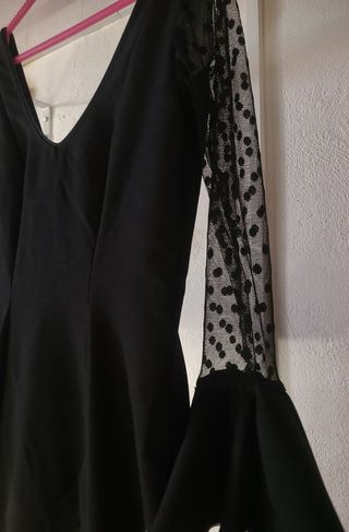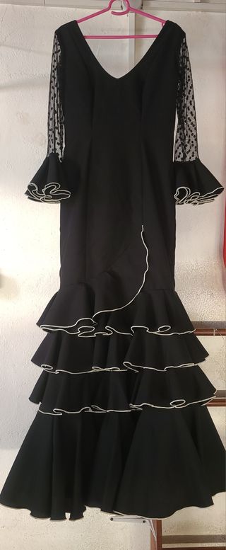 Traje de flamenca en color negro. Presenta un diseño elegante con volantes. - Mangas de tul con lunares y volantes. - Múltiples volantes en la falda. - Cancán y bolsillo Acepto ofertas