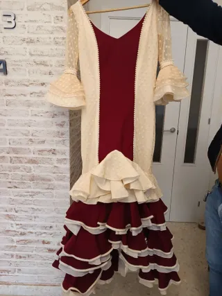 Traje de flamenca con un diseño elegante y volantes. - Mangas largas con volantes. - Cuerpo principal en color beige con detalles de lunares. - Falda con múltiples volantes en color rojo y beige. Tiene para cogerle o echarle en caso que se necesite. Solo 3 puestas.