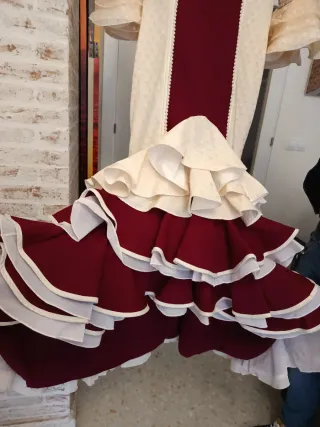 Es un traje de flamenca hecho a medida. Sería una talla 40-42, con posibilidad de ampliar a una talla más. • Color: rojo intenso con lunares blancos pequeños. • Corte: entallado hasta la cadera, realzando la figura, y a partir de ahí se abre con volantes en cascada. • En la falda, varios volantes superpuestos que aportan mucho movimiento y volumen. • En las mangas, volantes amplios a la altura del codo. En la enagua tiene un bolsillo para llevar todo lo necesario (llaves, monedero, barra labios…) Es un traje muy flamenco, femenino y tradicional, ideal para feria, El Rocío... con un aire clásico y elegante Costo mas de 400€