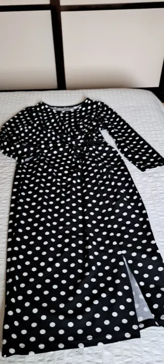 Vestido con estampado de lunares blancos sobre fondo negro. Presenta un diseño elegante con manga larga y una abertura lateral en la falda. - Estampado de lunares. - Manga larga. - Abertura lateral.