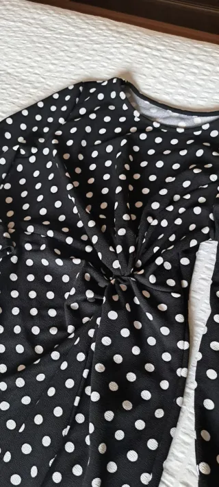 Elegante vestido de fiesta con un diseño asimétrico. - Cuerpo superior con volantes y estampado de lunares. - Manga larga en un lado. - Falda ajustada. - Usado en una boda de tarde. Esta completamente nuevo. En la etiqueta pone talla M pero da muy poquita talla. Yo uso la talla 34.