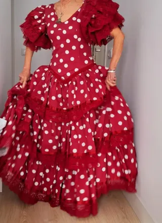 Traje de flamenca con un diseño clásico y alegre. - Estampado de lunares blancos sobre fondo rojo. - Mangas con volantes. - Falda con volantes en cascada. - Talla 38/4o -Tiene dos usos, casi nuevo, ideal para romerías.