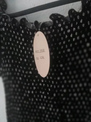 Vestido corto marrón con lunares blancos. Corte a la cintura, cuello de pico, manga abullonada en el hombro 3/4, volante en la falda. Talla 38-42 (tejido un poco elástico). Mango