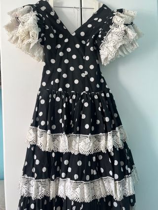 Vestido de flamenca con un diseño clásico de lunares. - Diseño de lunares negros sobre fondo blanco. - Falda con volantes. - Mangas largas. Se le puede sacar o meter tiene tela para hacerlo