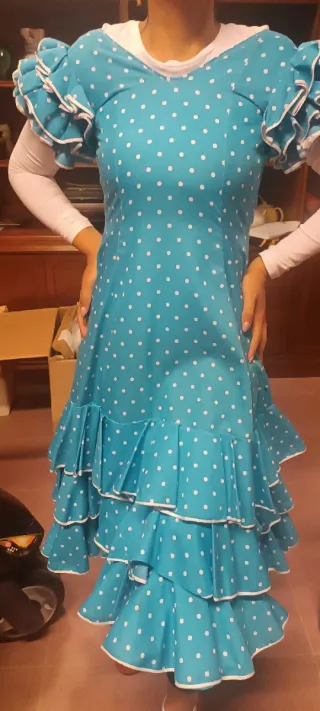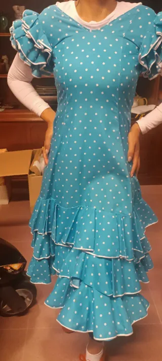 Traje de flamenca solo usado una vez - Estampado de lunares blancos sobre fondo turquesa. - Mangas con volantes y encaje. - Volantes en la falda con detalles en rosa y encaje.