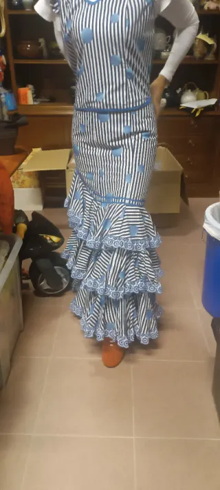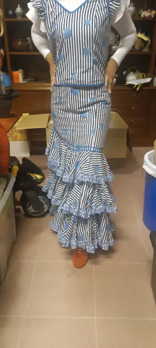 Vestido de flamenco de dos piezas con un diseño llamativo de rayas y lunares. Falda 90 de largo, 80 de cintura y 90 de cintura. Cuerpo: 80 pecho, 43 sisa, 90 cintura - Diseño de rayas verticales y lunares azules. - Falda con volantes y detalles de encaje. - Mangas con volantes.