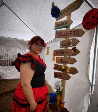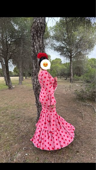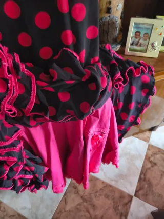 Vestido de flamenca hecho a medida – Esperanza Moda Flamenca Vestido de flamenca confeccionado a medida por Esperanza Moda Flamenca. Diseño muy elegante en color fucsia con lunares blancos y volantes combinados con tejido floral. Tiene mangas con doble volante y escote en V tanto delante como en la espalda, muy favorecedor. La falda lleva varios volantes que dan mucho movimiento y forma al vestido, ideal para ferias, romerías o eventos flamencos. El vestido está sin estrenar, hecho completamente a medida. Coste original del vestido: 400 €. Medidas: • Pecho: 87 cm • Cintura: 70 cm • Cadera: 96 cm Largo 145 cm Pieza única