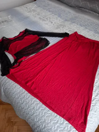 Conjunto de flamenca de dos piezas con un diseño llamativo, de fondo rojo y lunares negros. - Parte superior con volantes en las mangas. - Falda con múltiples volantes escalonados. - Estampado de lunares negros sobre fondo rojo. Cremallera en la falda y también en la parte de arriba.