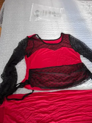 Conjunto de dos piezas para danza oriental, con un diseño vibrante y elegante. - Top con mangas largas de malla negra con lunares. - Falda larga roja con abertura. - Cinturon no incluido