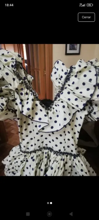 Vestido de flamenca con volantes en las mangas y falda. - Diseño de lunares. - Talla L/XL. Precio : 19.99€ Se recoge en mano : -Madrid (a concretar día lugar y hora.)Por compras minimas. -Toledo unicamente en el Pueblo La Guardia. Hago envíos a través de Wallapop.