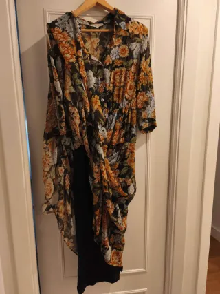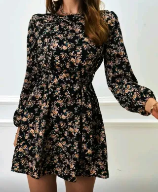 Vestido de mujer con estampado floral sobre fondo negro. Es una prenda seminueva en perfecto estado. - Diseño con escote en V. - Mangas largas abullonadas con puño elástico. - Cuerpo fruncido y falda con volantes. - Largo mini.