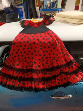 Traje de flamenca con un diseño clásico de lunares. - Mangas acampanadas con volantes. - Volantes en la falda. - Tejido cómodo y ligero. - Tiene para sacarle.