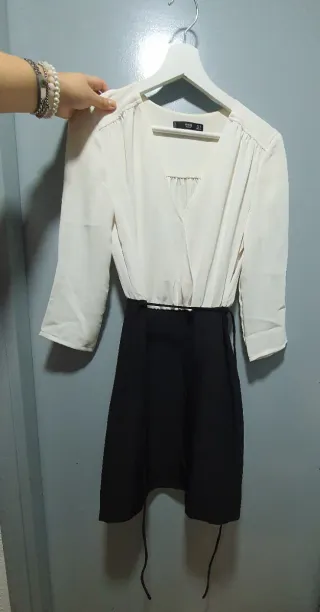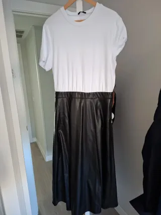 Vestido combinado de Zara con cuerpo blanco y falda negra. - Cuerpo de camiseta de manga corta. - Falda de efecto piel. - Cintura elástica.