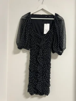 Vestido de Zara con un diseño elegante y moderno. - Tejido de tul con lunares. - Mangas abullonadas. - Fruncido en la falda.