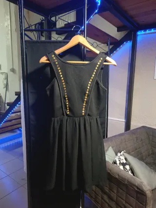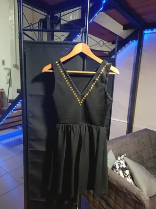 Vestido negro con un diseño moderno y elegante. - Escote en V adornado con tachuelas doradas. - Cintura marcada con falda acampanada. - Diseño sin mangas.