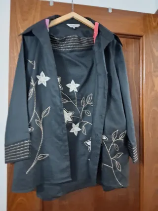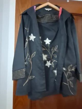 Elegante traje de dos piezas para mujer, confeccionado en lino. Presenta un diseño con bordados florales y detalles en las mangas. - Dos piezas. - Material: Lino. - Diseño con bordados. - Detalles en mangas.