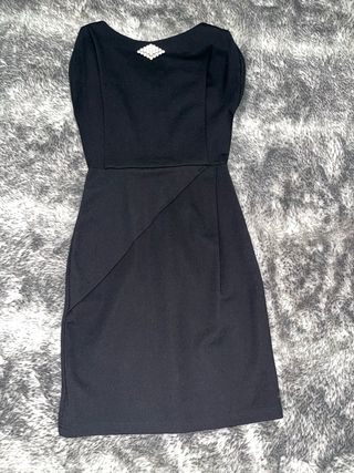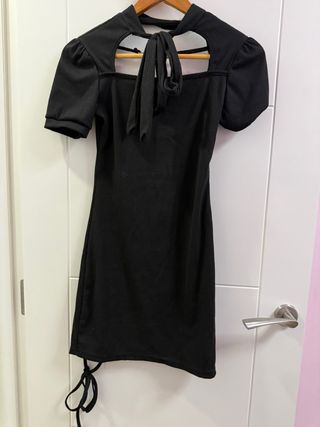 Vestido negro con corte en la espalda, de espalda hace efecto de llevar una falda y una camiseta
