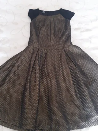 Vestido de Mango con un diseño llamativo y elegante. - Tejido con hilos metalizados dorados y negros. - Corte ajustado. - Detalle de drapeado en la falda.