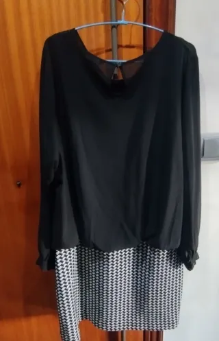 Vestido de la marca Axara con un diseño original. - Parte superior con estampado de zig-zag en blanco y negro. - Falda lisa en color negro. - Diseño sin mangas.