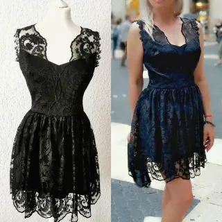 Elegante vestido negro con detalles de encaje. - Escote en V con borde festoneado. - Mangas cortas de encaje. - Falda con vuelo. - Bajo con acabado de encaje.