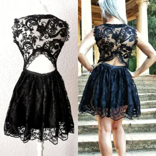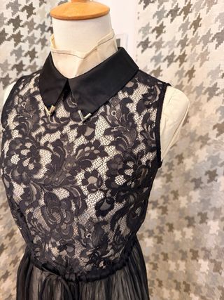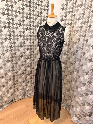 Elegante vestido negro con detalles de encaje y transparencias. Ideal para eventos especiales. - Diseño sin mangas. - Cuerpo de encaje. - Cintura elástica. - Falda evasé con caída.