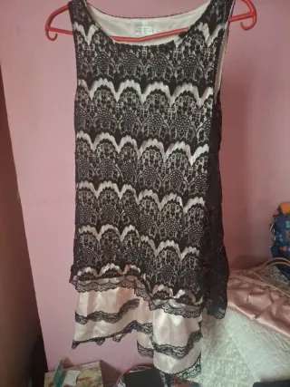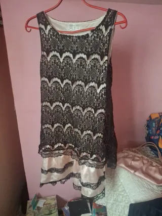 Elegante vestido de fiesta con un delicado encaje. - Diseño sin mangas. - Detalle de volantes en la falda. - Acabado con puntilla en el bajo.