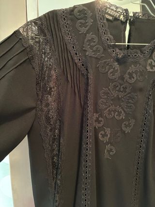 Vestido negro con detalles de encaje y transparencias. - Mangas largas de malla. - Escote en V con aplicaciones de encaje. - Falda ajustada hasta la rodilla. Vestido negro a estrenar, con etiqueta, t-M (38-40 ), cuerpo transparente, con bordados en la parte delantera del cuerpo, abrocha con cremallera en la espalda, tejido elástico, se adapta perfectamente al cuerpo, elegante y extremado a la vez, gracias por mirar mi perfil !#fin de año #fiesta # cocktel