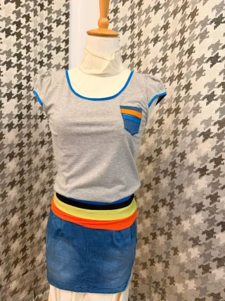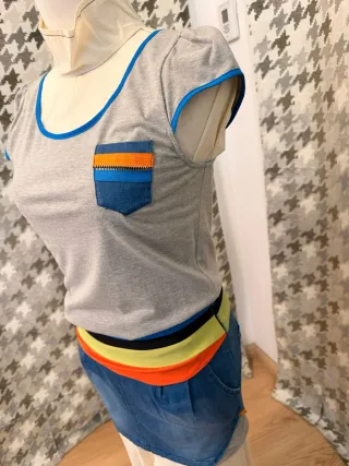 Vestido con un diseño moderno y juvenil. - Cuerpo gris con ribete azul en cuello y mangas. - Bolsillo frontal con detalles de tela vaquera y naranja. - Cintura elástica con bandas de colores: negro, azul, amarillo y naranja. - Falda de tela vaquera.