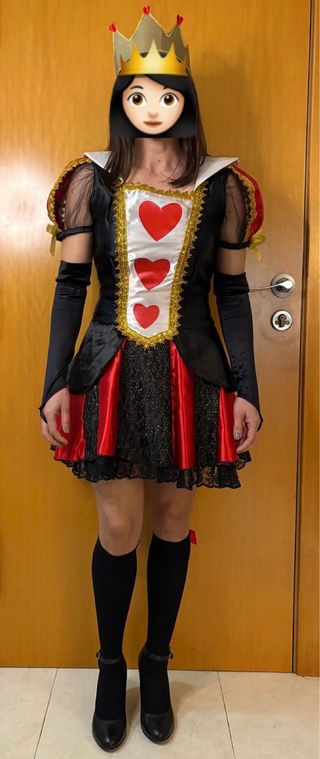 Este disfraz de reina de corazones es ideal para fiestas temáticas o disfraces. - Diseño inspirado en la reina de corazones. - Mangas cortas con detalles dorados. - Falda con capas de tela roja y encaje negro. - Incluye medias, guantes y corona Modelo talla S/M, 1.55cm de altura