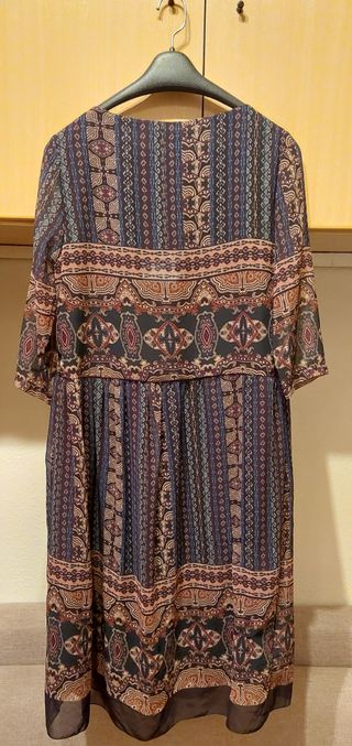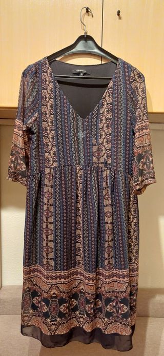 Vestido estilo boho, de manga francesa, cuello en V, estampado étnico fondo negro en marrón y azul. Lleva forro el cuerpo y la falda. Composición 95% poliéster y 5% elastano.