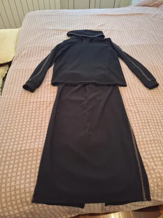Conjunto de jersey con capucha y falda larga. - Jersey de manga larga con capucha. - Falda larga hasta los tobillos de 80cn. Con goma. - Detalles de costura dorada en mangas y falda.