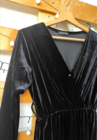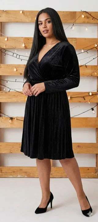 Elegante vestido negro de terciopelo con un diseño cruzado en el escote y falda plisada. - Tejido suave y brillante. - Mangas largas. - Largo hasta la rodilla.