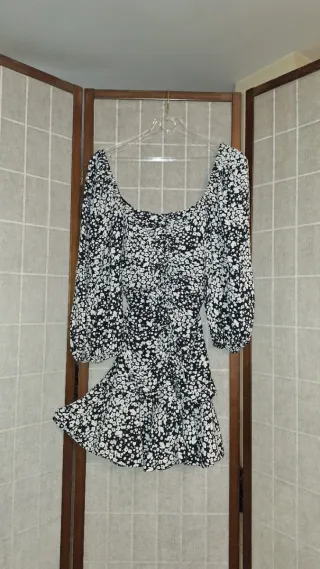 Precioso vestido corto con un bonito estampado floral en blanco y negro. Presenta un diseño fruncido en la parte delantera y mangas largas abullonadas y un volante que lo hace super vaporoso y super bonito el patrón. El tejido es crep con mucha caida. Sienta sensacional. - Escote pronunciado. - Falda con volantes.