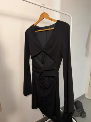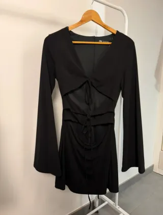 Vestido negro de Zara con un diseño moderno y favorecedor. - Escote pronunciado en V. - Mangas acampanadas. - Detalle de lazada en el escote. - Corte cut-out en la cintura. - Falda drapeada.