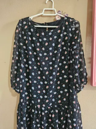 Vestido corto con estampado llamativo, ideal para eventos o fiestas. - Largo: 80; largo falda: 42; contorno cintura elástica: de 66 a 90; contorno pecho: 96; largo manga: 60 - Diseño con cuello con volante y detalle de botones. - Mangas largas con puños fruncidos. - Cintura elástica para un ajuste cómodo. - Falda con vuelo y forro negro.