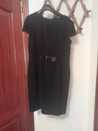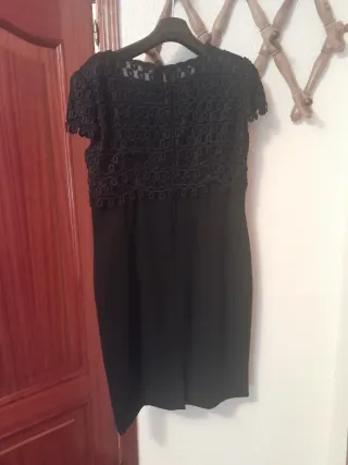 Elegante vestido negro con detalles de encaje en el corpiño y mangas largas. - Diseño con cremallera. - Falda con vuelo.